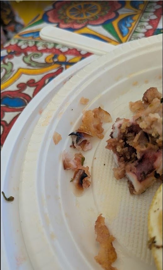 The meal was a disaster. The "calamari" turned out to be baby octopus—and it was just warm. The bruschetta was basically raw bread with some tomato slapped on top. Then, while chewing on the cold octopus, I felt something sharp. I pulled a black beak out of my mouth. Then another. And another. Calamari is Italian for squid—they can’t even get their cephalopods right!